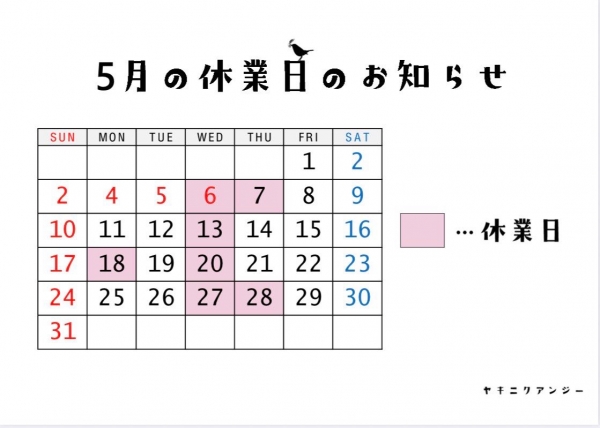 いつもご利用ありがとうございます。5月の休業日のお知らせです。よろしくお願いします。