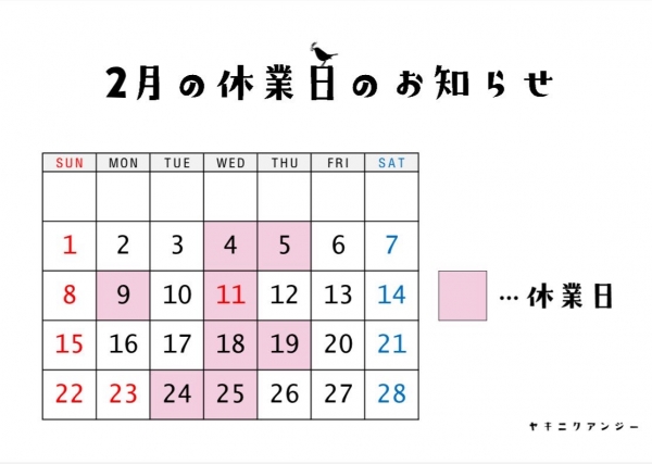 2月の休業日のお知らせ。