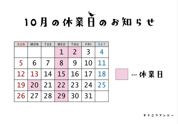 いつもご利用ありがとうございます。10月の休業日のお知らせです。宜しくお願いします。