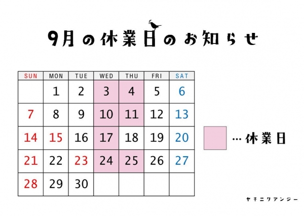 いつもご利用ありがとうございます。9月の休業日のお知らせです。宜しくお願い致します。