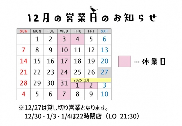 いつもご利用有り難うございます。12月、年末年始の営業日のお知らせです。宜しくお願い致します。