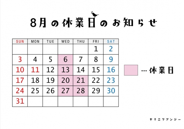 いつもご利用ありがとうございます。8月の休業日のお知らせです。宜しくお願い致します。